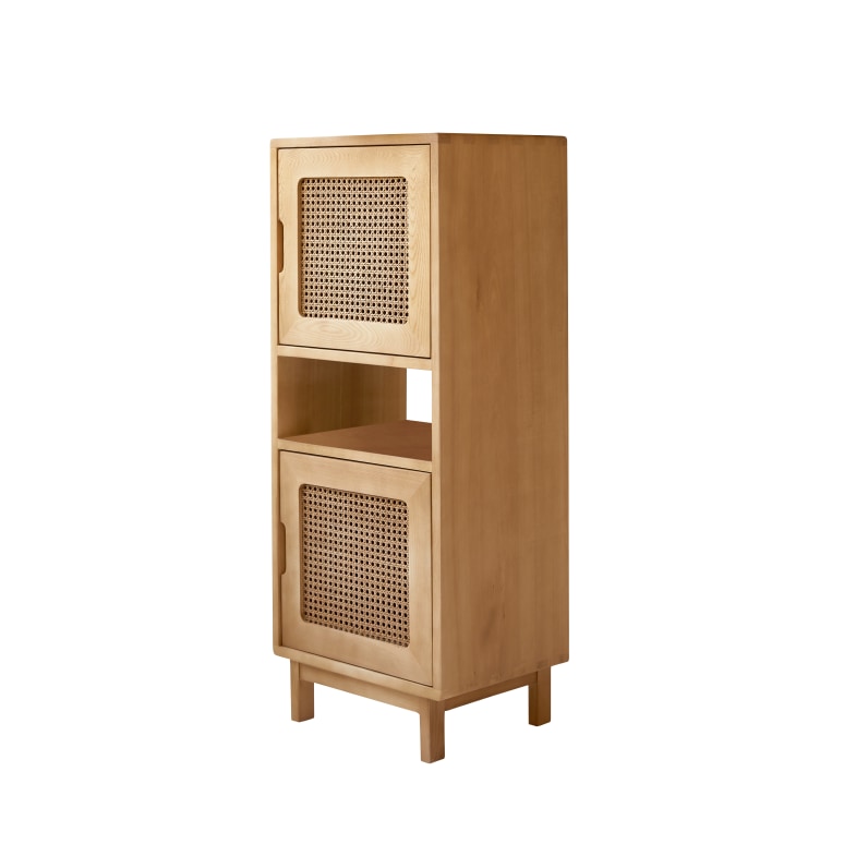 Lage boekenkast van massief iepenhout en vlechtwerk