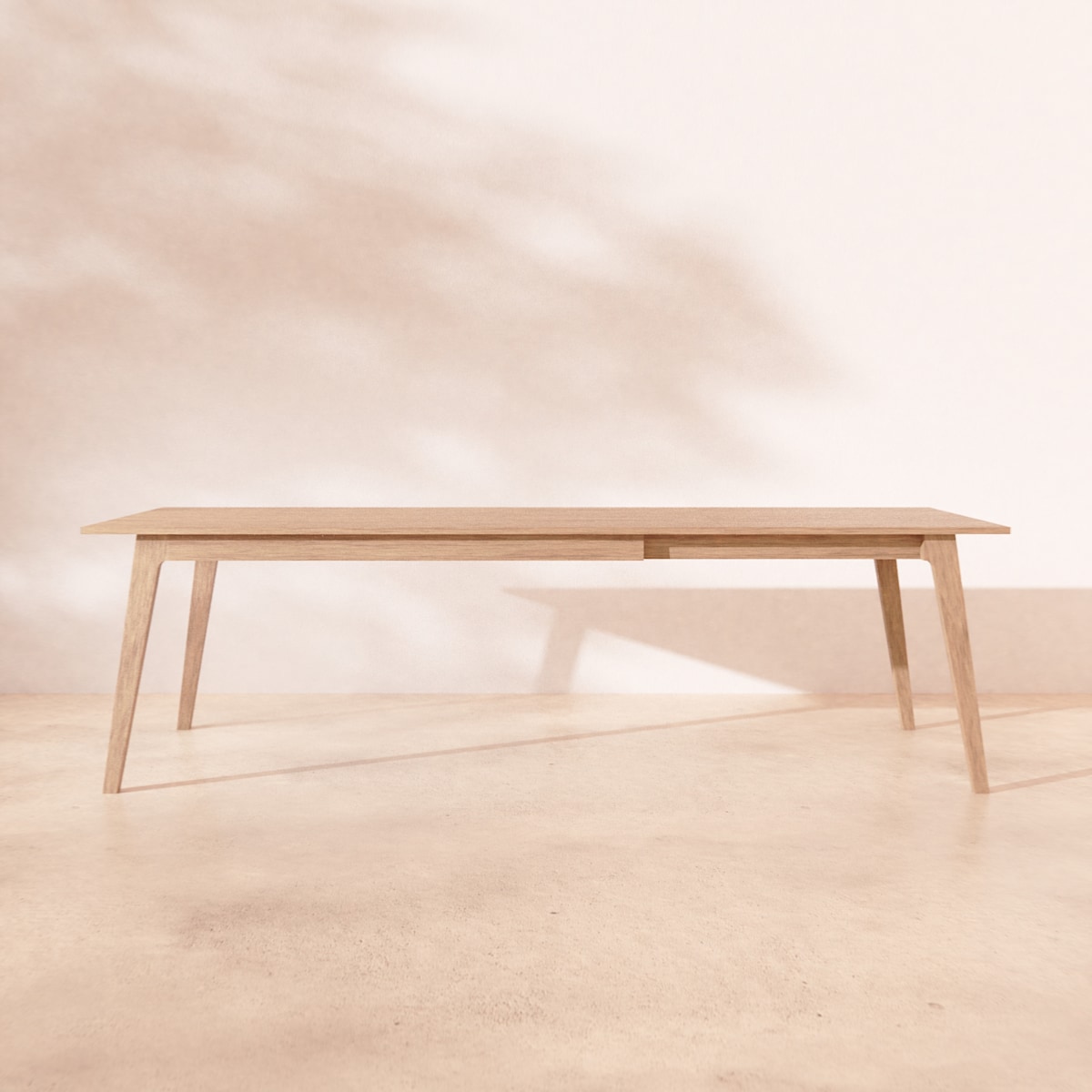 tafel van 180 cm + verlengblad van 80 cm (2 verlengbladen opgeborgen onder de tafel).