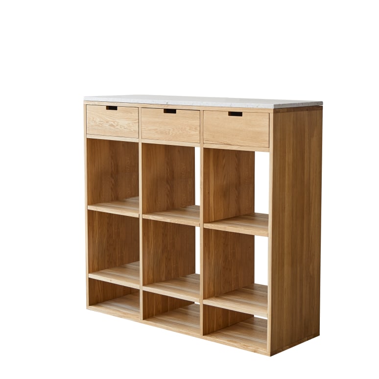Het Miho dressoir van massief eikenhout en wit premium terrazzo brengt een natuurlijk accent in elk interieur. Het biedt praktische opbergruimte voor boeken en decoratieve objecten, terwijl het blad van terrazzo – een duurzaam en onderhoudsvriendelijk materiaal – perfect is voor groene planten of als extra werkruimte in de keuken. De open vakken zijn ideaal voor het organiseren van bakken en potten, zoals zero-waste voorraadpotten.