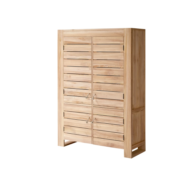 Ontdek een elegant massief teakhouten dressoir met latten, voorzien van een FSC®-certificaat: een stijlvolle en praktische opbergoplossing. De twee bovenste deuren openen naar drie ruime nissen, terwijl de onderste deuren toegang bieden tot twee extra opbergvakken.